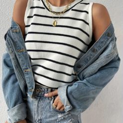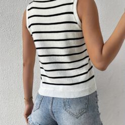 Camiseta de rayas con cuello redondo, top sin mangas casual para el verano, ropa de mujer – White