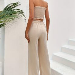 Conjunto de pantalones casuales con textura estilo vacaciones, top corto con volantes con decoración de lazo y pantalones de pierna recta – Apricot