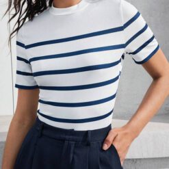 Camiseta De Rayas De Manga Corta Para Mujer – Azul y blanco