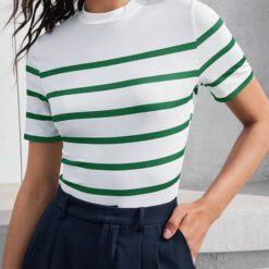 Camiseta De Mujer De Cuello Alto Con Rayas Contrastantes – Verde