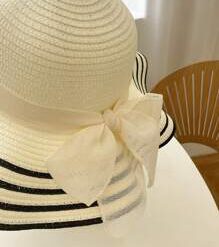 1 Sombrero Ondulado De Paja De Vacaciones Para Mujer De Rayas Caqui – Blanco