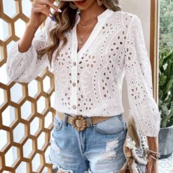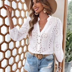 Blusa con bordado con ojal con botón delantero de manga farol – Blanco