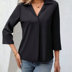 Camisa casual holgada de color sólido para mujer con mangas enrolladas para primavera/verano – Negro