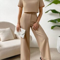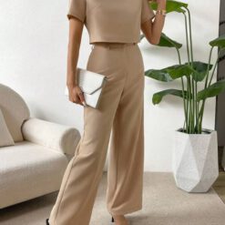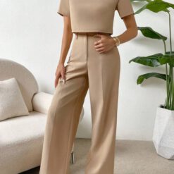 Camisa crop unicolor & Pantalones de pierna ancha – Camel