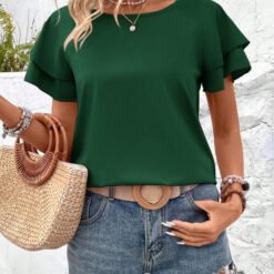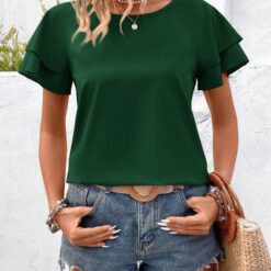 Camisa De Manga Corta De Cuello Redondo Con Volantes En Color Sólido Para Mujer – Verde
