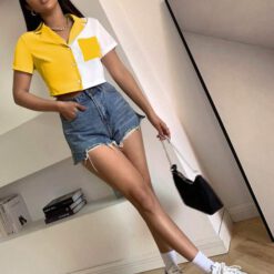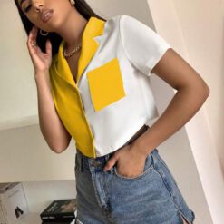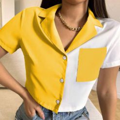 Camisa masculina con bloque color y botones al frente, con manga corta para verano – Amarillo