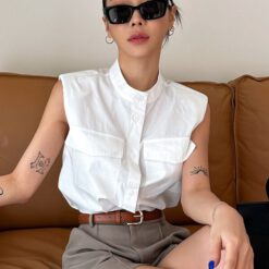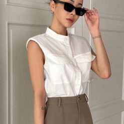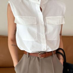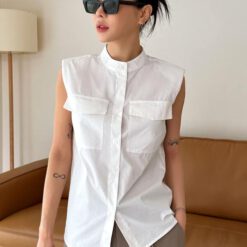 Camisa Sin Mangas Con Bolsillo De Solapa Y Botones Frontales – Blanco