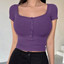 Camiseta casual de mujer de manga corta con media tapeta de botones – Morado