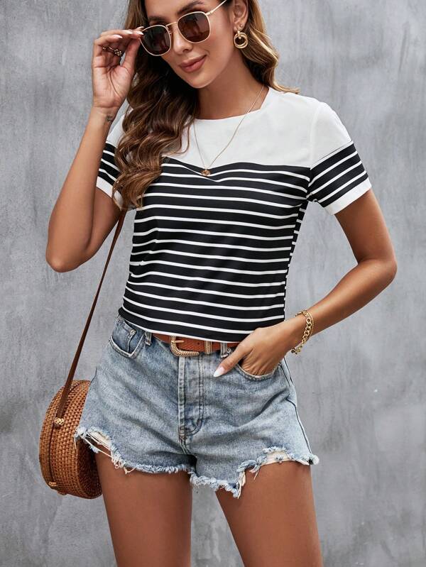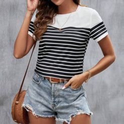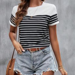 Camiseta con estampado de rayas de cuello redondo – Blanco y Negro