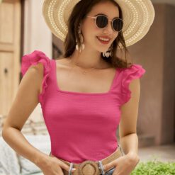 Camiseta de cuello cuadrado ribete con fruncido – Rosa Fucsia