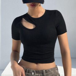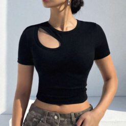 Camiseta De Manga Corta Ajustada Con Huecos Y Color Sólido – Negro