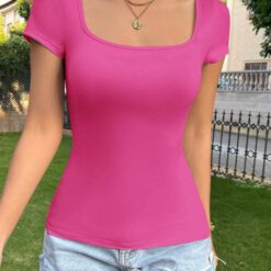 Camiseta de manga corta de cuello cuadrado de verano para mujer con unicolor y ajuste ceñido – Rosa Fucsia