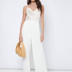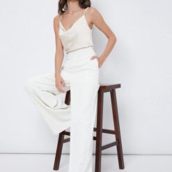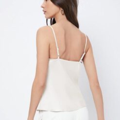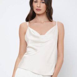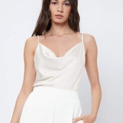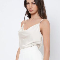 Camiseta de trabajo de mujer de cuello caído y cuello satinado de un solo color – Blanco