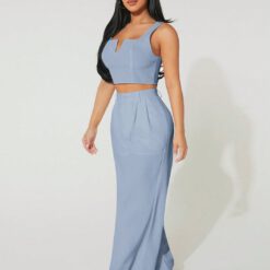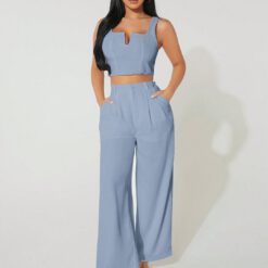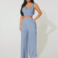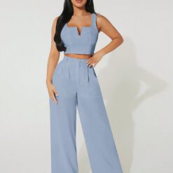 Camiseta Sin Mangas Corta De Verano Para El Trabajo Diario Y Pantalones Anchos De Pierna Con Pliegues – Celeste