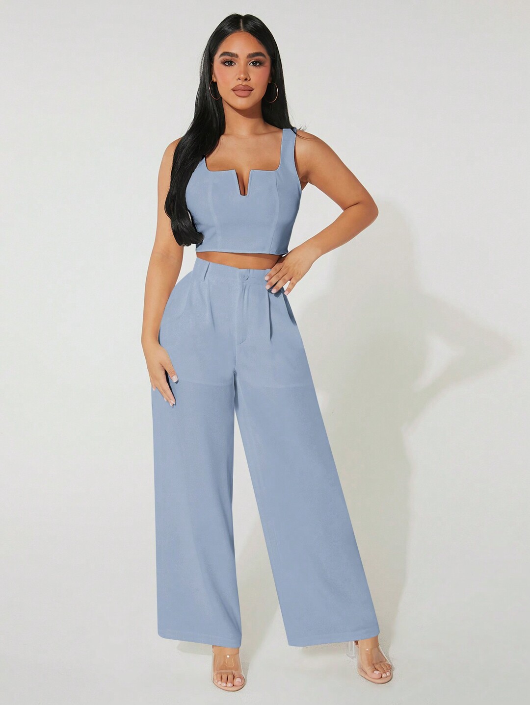 Camiseta Sin Mangas Corta De Verano Para El Trabajo Diario Y Pantalones Anchos De Pierna Con Pliegues – Celeste