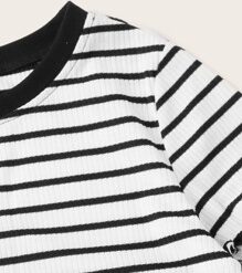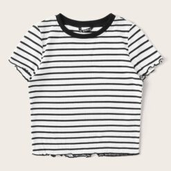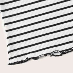 Camiseta tejida de canalé de rayas ribete en forma de lechuga – Blanco y Negro
