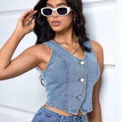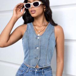 Chaqueta y abrigo de mezclilla sin mangas de moda para mujer – Lavado ligero