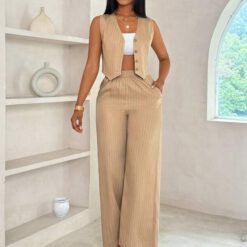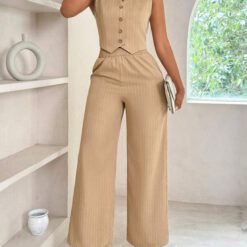 Conjunto de blusa a rayas de verano para mujer con botón frontal sin mangas y pantalones anchos – Caqui
