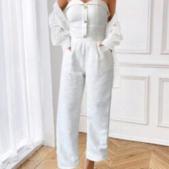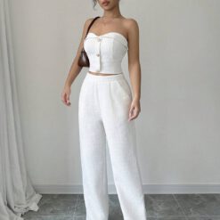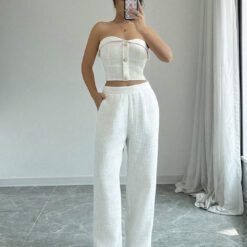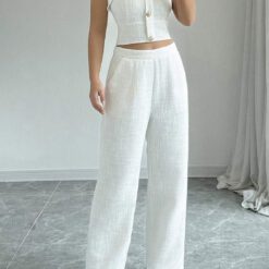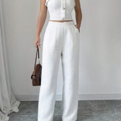 Conjunto de dos piezas para mujer, top sencillo de unicolor con botones en la parte trasera y pantalones de cintura alta – Blanco