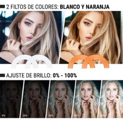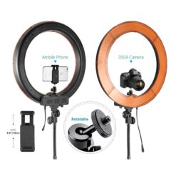 El kit incluye: (1) Aros de luz LED de 18 «/ 48cm 55W 5500K + (1) Soporte de luz de 61» / 155cm + (1) Tubo suave + (1) Juego de filtros de color blanco y naranja + (1) Adaptador de cabeza esférica + (1) Adaptador de corriente universal con enchufe + (1) Soporte para teléfono inteligente + (1) Bolsa de transporte para anillo de luz.