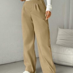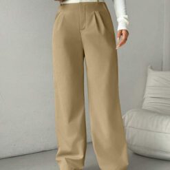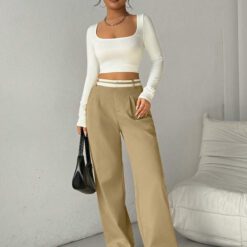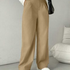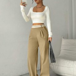 Pantalones casuales rectos para mujer con cintura alta decorada con cinturón y bolsillos con diseño de bloques de color – Caqui