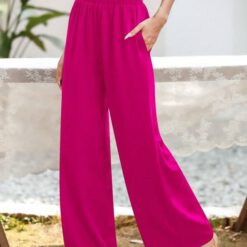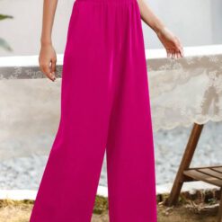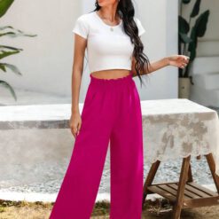 Pantalones casuales sueltos de mujer de unicolor con dobladillo con volantes – Rosa Fucsia