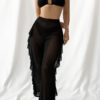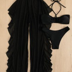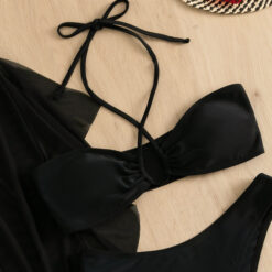 Set bikini unicolor Top sujetador sin aro halter con tira cruzada & Bottom bikini corte alto & pantalones cover up de malla Traje de baño de 3 piezas – Negro