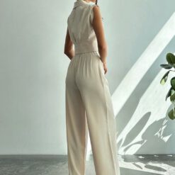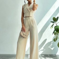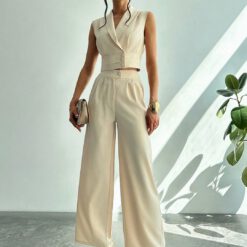 Set de 2 prendas de vestir: Blusa con cuello y cintura ceñida + Pantalones de pierna recta – Caqui