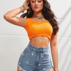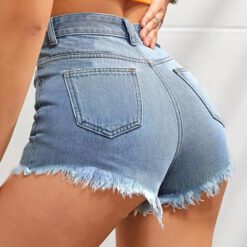 Shorts en mezclilla con bordado floral bajo crudo – Azul lavado medio
