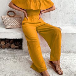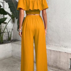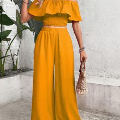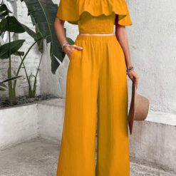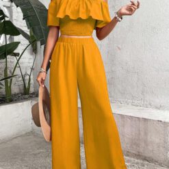 Top de hombros descubiertos ribete con fruncido & Pantalones de pierna ancha – Amarillo