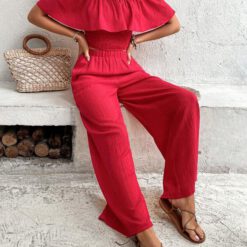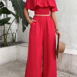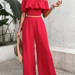 Top de hombros descubiertos ribete con fruncido & Pantalones de pierna ancha – Rojo