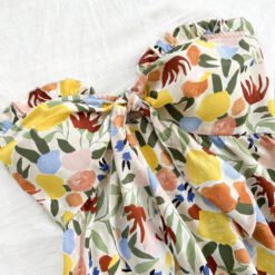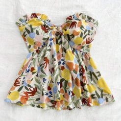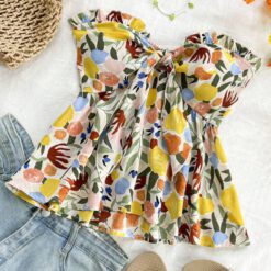 Top sin tirantes con nudo delantero y detalle de volantes con estampado de frutas – Multicolor