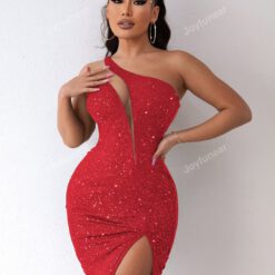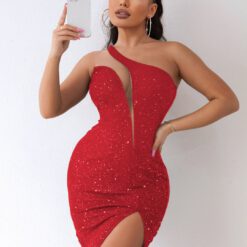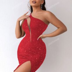 Vestido ajustado de un hombro de malla bajo con abertura con lentejuelas – Rojo