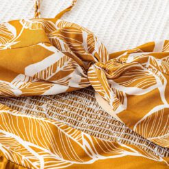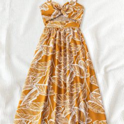 Vestido amarillo de tirantes espagueti con diseño de hojas tropicales – Multicolor