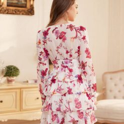Vestido con estampado floral multicapa con volantes y cinturilla, para primavera y verano – Rojo