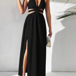 Vestido de fiesta de unicolor con escote en V profundo, abertura y detalle de hueco con cuello halter para mujer – Negro