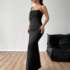 Vestido de mujer de tirantes con espaguetis y abertura alta en un solo color – Negro