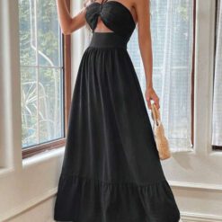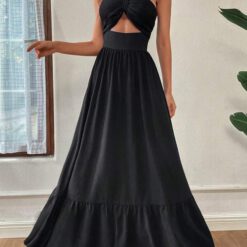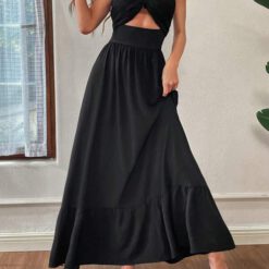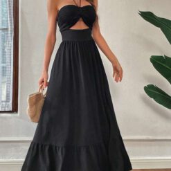 Vestido de mujer tejido largo sólido con cuello halter y espalda descubierta para vacaciones – Negro