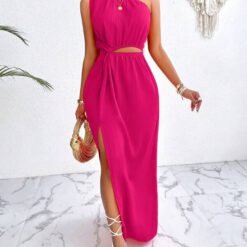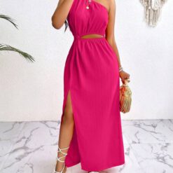 Vestido De Playa Asimétrico De Color Sólido Con Cintura – Rosa Fucsia