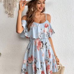 Vestido de primavera con estampado floral, hombros descubiertos y dobladillo con volantes – Celeste