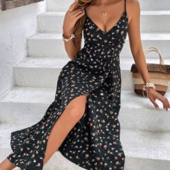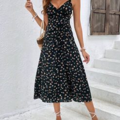 Vestido de tirantes con estampado floral bajo cruzado – Negro