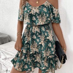 Vestido de tirantes de verano para mujer con estampado floral y botánico romántico y dobladillo de volante – Verde