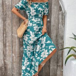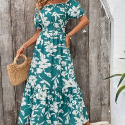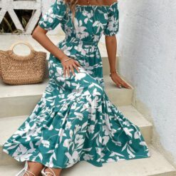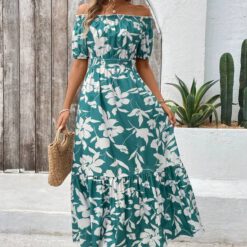 Vestido de vacaciones de un hombro para mujer con cintura y dobladillo con volantes + (estampado aleatorio) – Verde