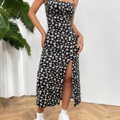 Vestido De Vacaciones Estampado De Punto Con Tirantes Estilo Espagueti Y Abertura Lateral Para Mujer – Multicolor