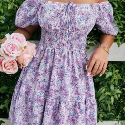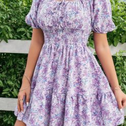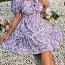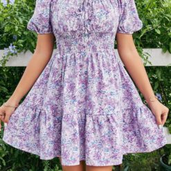 Vestido floral de mangas abullonadas y cuello cuadrado para mujer – Púrpura malva