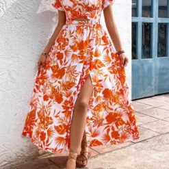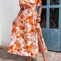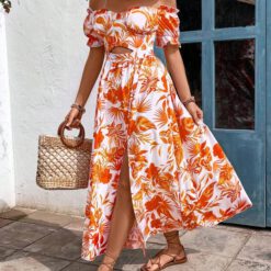 Vestido largo de flores y plantas de un solo hombro con abertura alta y huecos – Multicolor