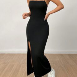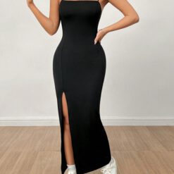 Vestido largo negro de mujer con correa de abertura alta y unicolor – Negro