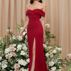 Vestido rojo borgoña de hombros descubiertos con abertura en el muslo – Burdeos