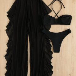 3 piezas con estampado floral Bañador bikini halter & desmontable Falda de playa – Blanco